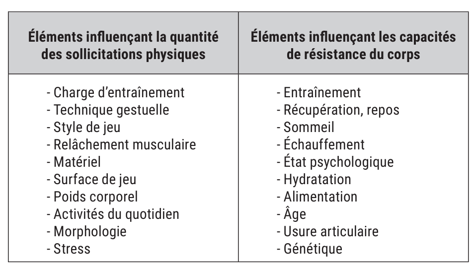 Trop solliciter son corps, ça veut bien évidemment dire « en faire trop » (en termes de fréquence, de durée ou d’intensité), mais d’autres facteurs peuvent aussi, dans une moindre mesure, y contribuer, comme une mauvaise technique, un style de jeu trop exigeant, ou encore une raquette qui ne favorise pas assez la puissance, obligeant à fournir davantage d’efforts pour frapper la balle.